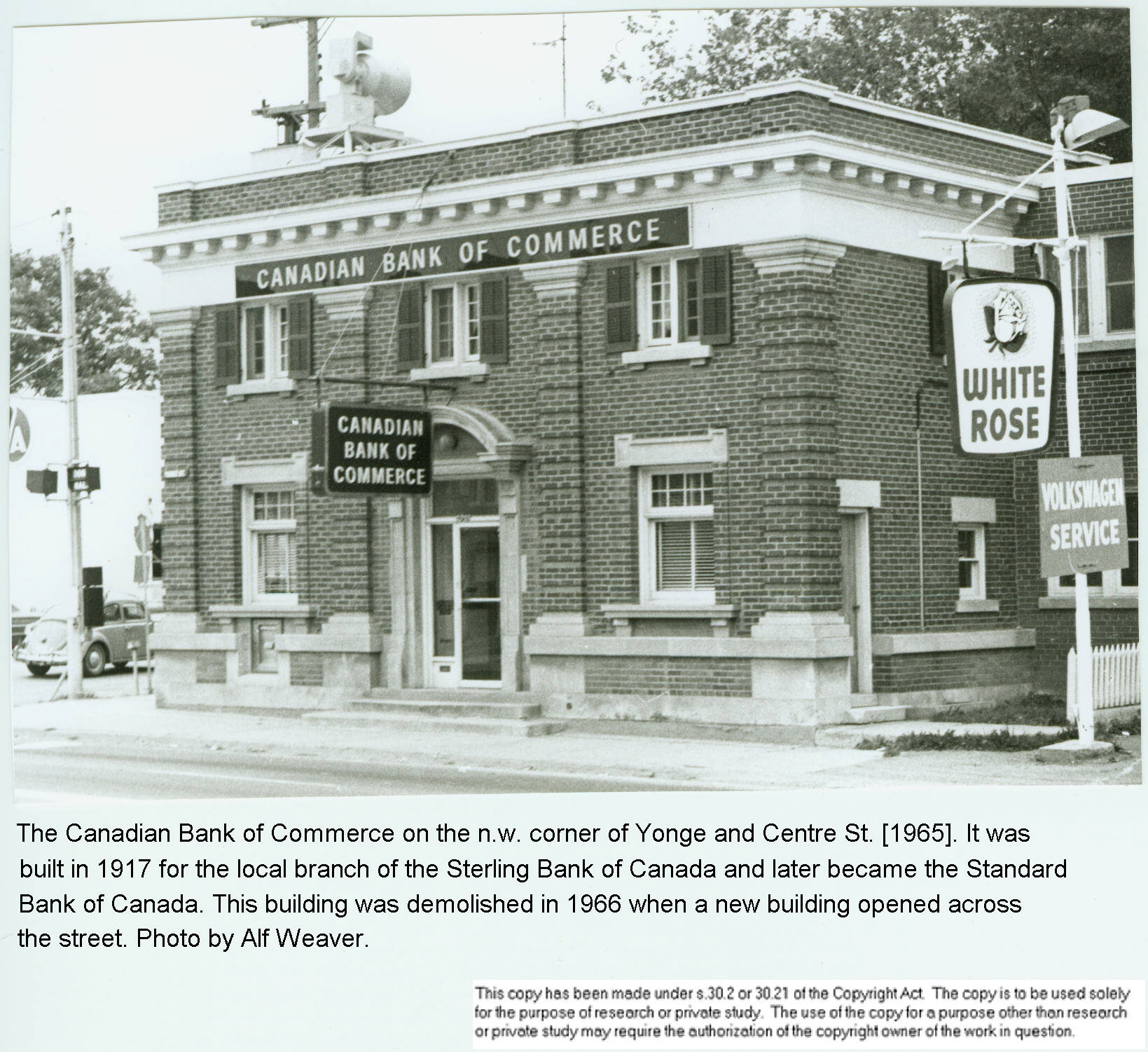 Canadian Bank of Commerce on the n.w. corner of Yonge and Centre St. [1965]. Photographer-- Alf Weaver. LIBRARY document |
