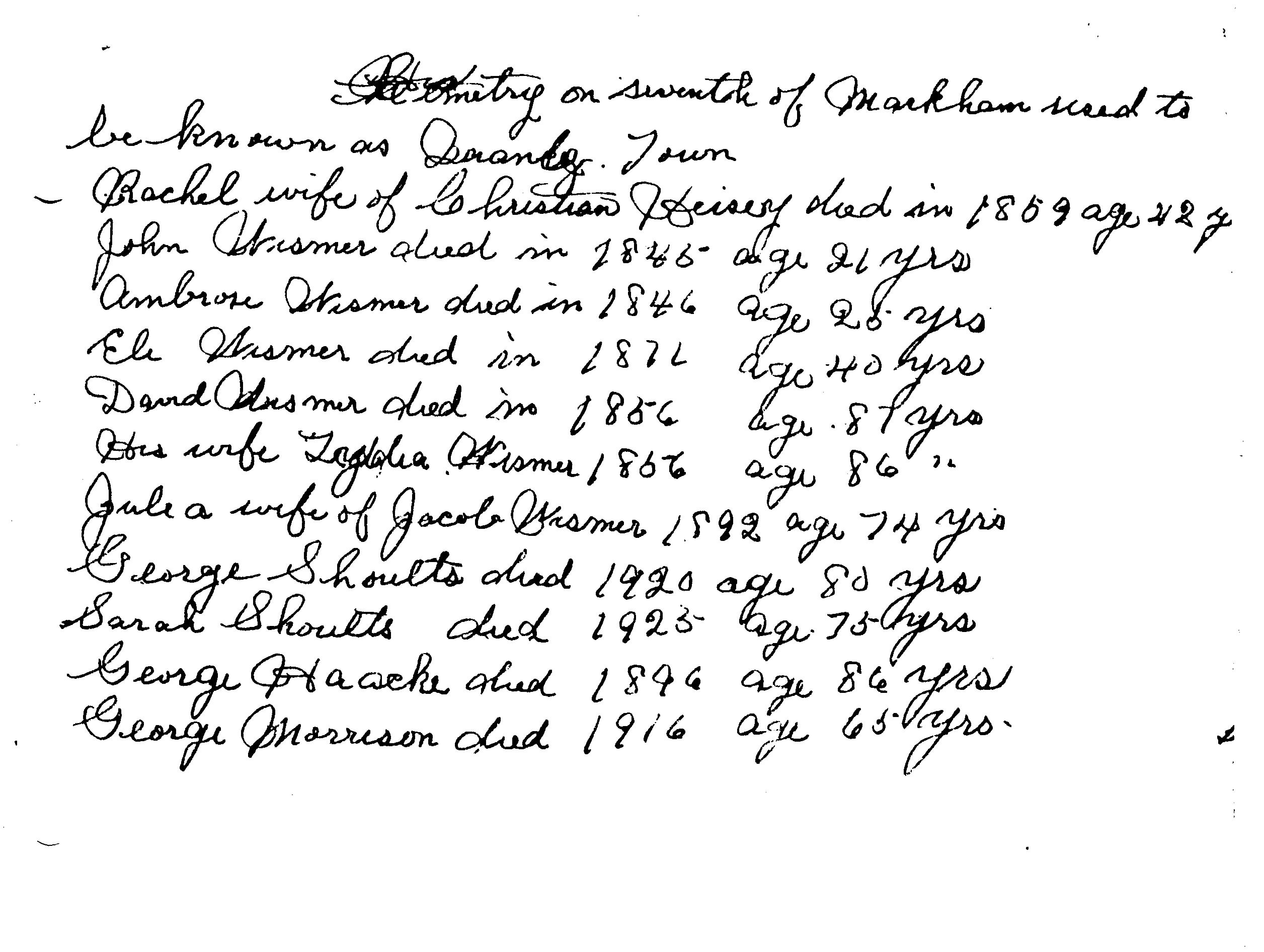 Quantstown Cemetery (index, handwriting). Lot 15 Con 6, Markham twp. Recorded by Elizabeth Hancocks, 1971. LIBRARY document |