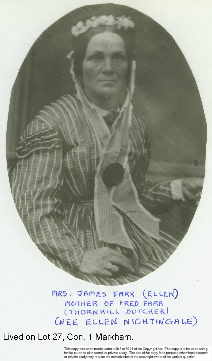 | Mrs. James Farr (nee Ellen Nightingale) of Lot 27, Con. 1 Mk. Photographer-- unknown. | |